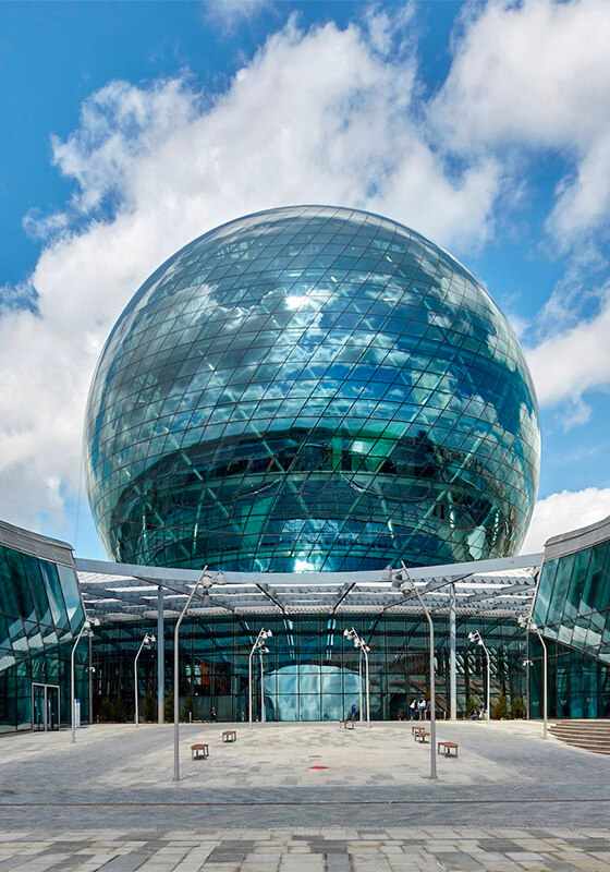 Павильон «Нур-Алем» Павильон «НурАлем» единственное в мире здание, являющиеся сферой законченной формы диаметром 80 метров. На объекте Нур-Алем применяются новейшие фотоэлектрические технологии, которые позволяют вырабатывать электроэнергию без нарушения задуманного футуристического дизайна. Тематическая концепция самого Нур-Алема представлена как «Музей Энергии Будущего» и состоит из 8 этажей. Экскурсия начинается с 8 этажа, где представлена – Будущая Астана. На 7м этаже вы сможете увидеть Энергию Космоса, на 6м – Энергию Солнца, на 5м – Энергию Ветра, на 4м – Энергию Биомасс, на 3м – Кинетическую Энергию, на 2м – Энергию Воды и, наконец на 1м этаже – Павильон Казахстана, где он разделен на две основные зоны – зона знакомства с Казахстаном и зона «Созидательная энергия».