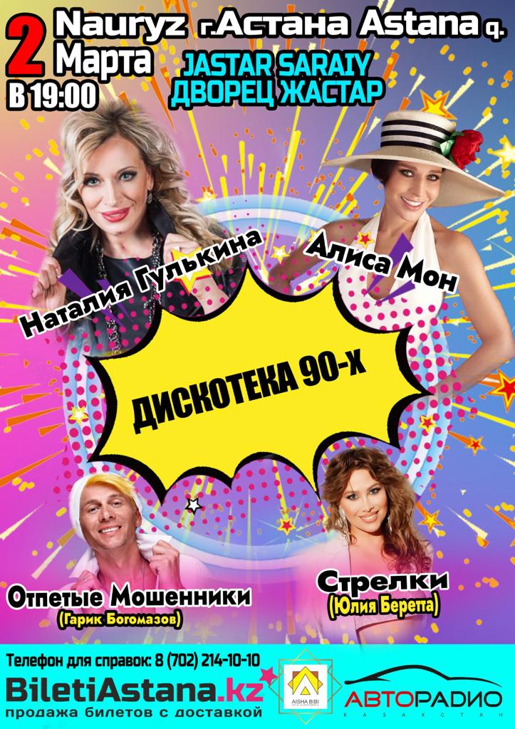2 марта во Дворец Молодежи Жастар превратится в большой танцпол, где можно будет танцевать даже на сидячих местах! Большой концерт “Дискотека 90х”- это увлекательный, полный приятной ностальгии полет в мир любимой музыки девяностых-нулевых годов и настоящий калейдоскоп самых дорогих сердцу песен. Музыка нашей молодости, главные хиты школьных танцполов! В этот вечер прозвучат песни, которые знает и поет вся страна.