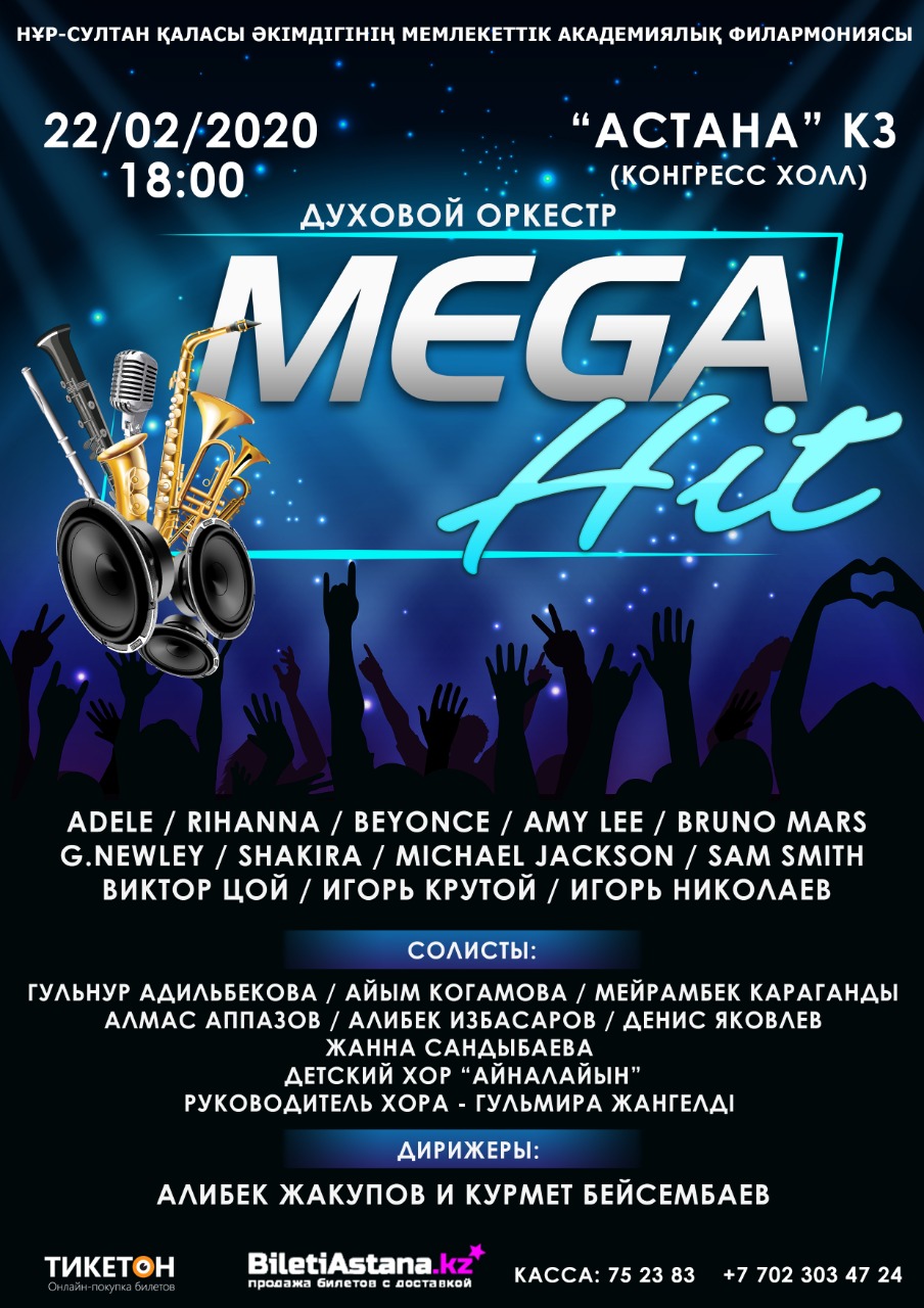 22 февраля Духовой оркестр Государственной академической филармонии акимата города Нур-Султана под управлением Алибека Жакупова представит концерт «MEGA HIT». Вечер состоится в концертном зале «Астана» в 18.00.