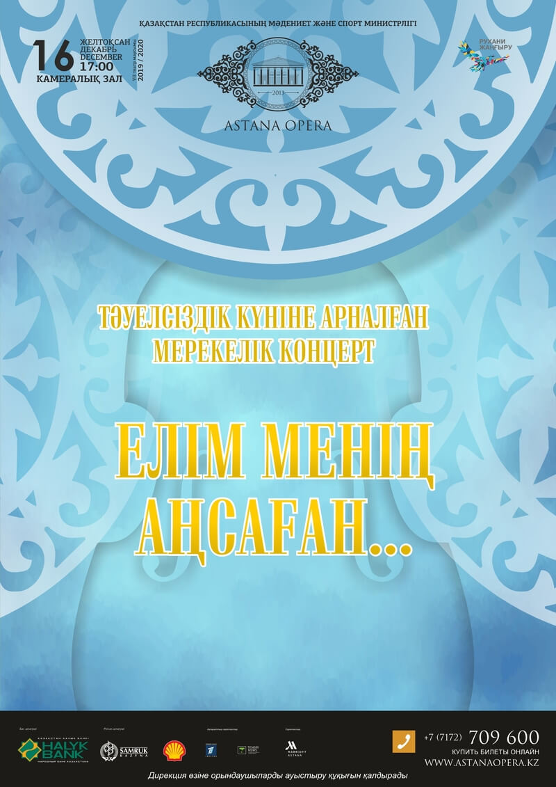 16 декабря в Камерном зале театра «Астана Опера» состоится праздничный концерт, посвященный Дню Независимости Казахстана.