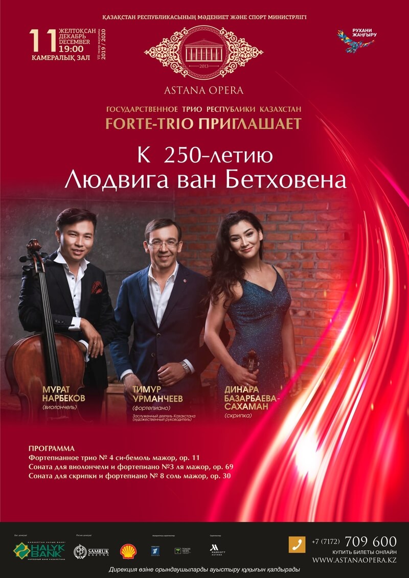 Государственное трио РК «FORTE-TRIO» Государственной концертной организации «Қазақконцерт» Министерства культуры и спорта РК продолжает серию концертов в Камерном зале «Астана Опера».