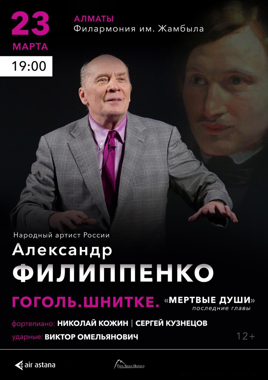 Актёр расставил акценты так, что вам может показаться, будто Н. В. Гоголь писал в 21 веке. За свой моноспектакль «Мертвые души. Последние главы». Александр Филиппенко получил Государственную премию. Но актер не стоит на месте – теперь новый проект – «В поисках живой души» или «Мертвые души. Последние главы. Гоголь-Шнитке»- больше, чем виртуозное исполнение «Мертвых душ».