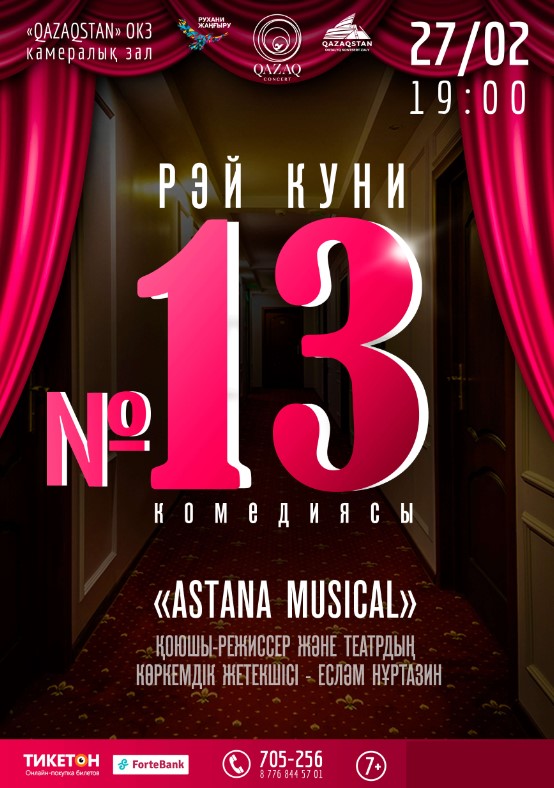 Яркие таланты Нур-Султана – театр «Астана мюзикл» представит известную комедию английского драматурга Рэя Куни «№13». Постановка состоится 8 февраля в 18:30 часов в камерном зале ЦКЗ «Қазақстан».