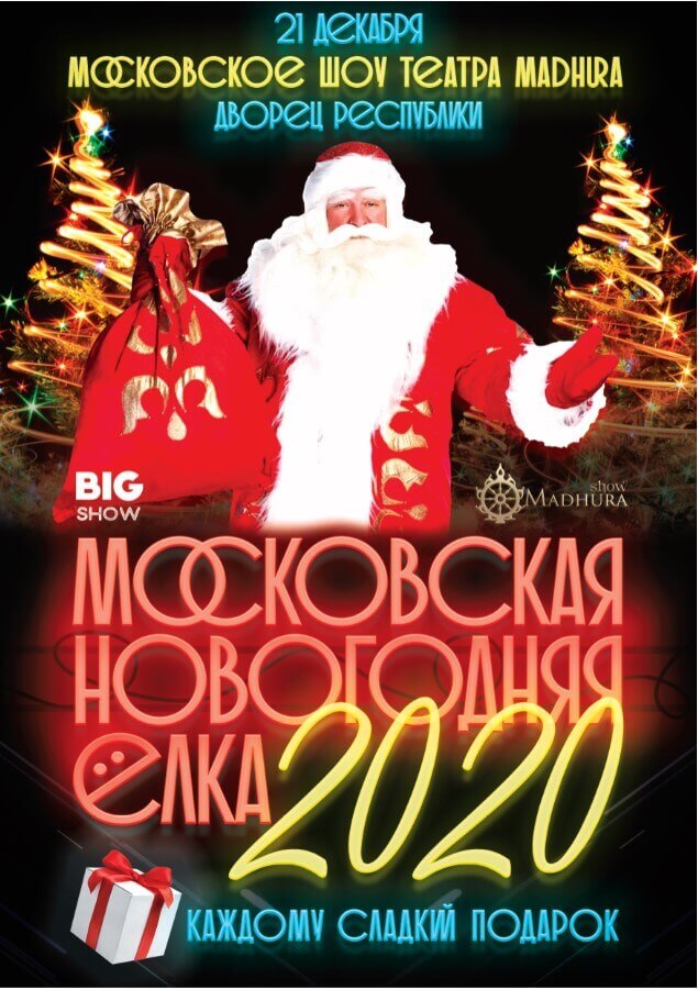 Концертное агентство «Big Show» и Московский театр «Madhura» приглашают Вас на световое новогоднее шоу «Московская новогодняя ёлка 2020», только 21 декабря во Дворце Республики. Театр “Madhura” – участник крупнейших международных фестивалей: “Круг света”, Москва; “Glastonbury festival 2017”, Pilton Somerset, Великобритания; фестиваль «Фриндж», Эдинбург, Шотландия; “Мистическая Индия”, Санкт-Петербург; участник проекта “Волшебный троллейбус” фонда Константина Хабенского. Светодиодные костюмы, захватывающие дух элементы шоу – все это предстанет перед искушенными зрителями и, несомненно, тронет их сердца зрелищностью костюмированного светового шоу. Дед Мороз и Снегурочка вместе со зрителями отправятся в путешествие по разным странам, где их ждет встреча с таинственными мировыми культурами (Япония, Китай, Индия и другие страны). Сказочные персонажи – могущественный Хануман (индийский Бог обезьян), мудрый медведь, величественный самурай, огненная змея, гордый петух, загадочные гейши, магический слон, крылатый дракон и безусловный символ 2020 года – крыса. Яркие костюмы, фантастические номера, интерактивный и увлекательный сюжет. Шоу позволяет детям полностью погрузиться в мир сказки и новогоднего чуда. В программе: