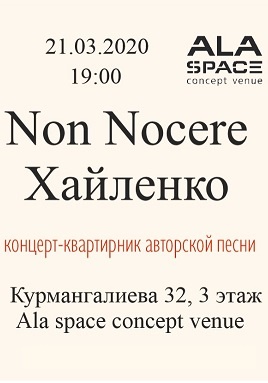 21 марта пространство Ala Space и Юрий Хайленко приглашают всех любителей авторской песни на концерт «Non Nocere»! Под аккомпанемент музыкальных инструментов Юрий Хайленко споет для зрителей свои авторские песни о дружбе и любви, о чести и счастье, о правде и праведности, и многом другом! Вместе мы будем смеяться и грустить, мечтать и размышлять…Ему помогают: Илья Башкатов – гитара, Евгений Калистратов – бас-гитара, Алияр Отетлеу – клавишные. Приходите!