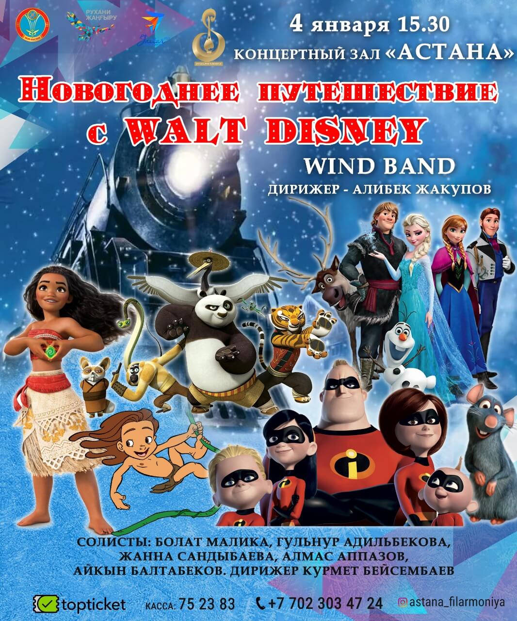4 января 2020 года Духовой оркестр Государственной академической филармонии акимата города Астана отправится со своими слушателями в новогоднее путешествие с Walt Disney. Дирижеры – Алибек Жакупов и Курмет Бейсембаев.
