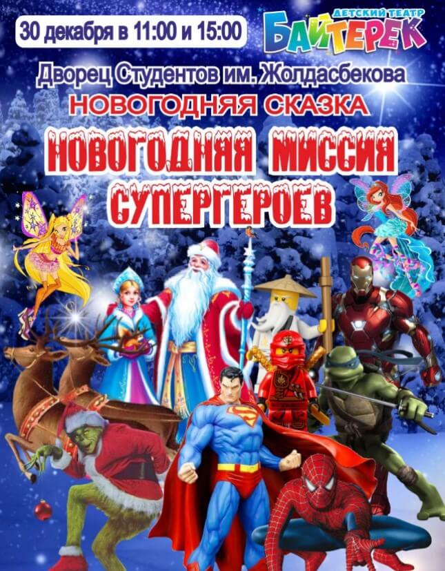 В первый день зимних каникул – 30 декабря Театр «Байтерек» приглашает Вас на Новогоднюю сказку «Новогодняя миссия Супергероев». Это современное музыкальное театрализованное представление, в котором задействованы любимые персонажи детей: Человек Паук, Супермен, Железный Человек, Черепашка Ниндзя, Лего Ниндзяго, Бэтмен, Феи Винкс Блум и Стелла.