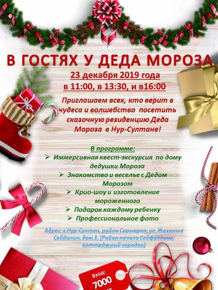 Приглашаем детей с 2 до 10 лет вместе с родителями посетить резиденцию Деда Мороза, которая будет открыта с 23 декабря по 30 декабря 2019 года в городе Астана!