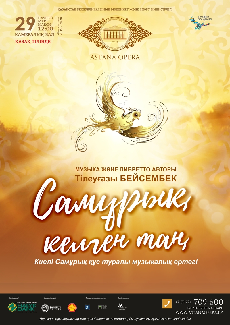 Творческий коллектив театра «Астана Опера» представляет юным зрителям новую музыкальную сказку «Самұрық келген таң». Она повествует о приключениях Айдара и Айжан, вышедших на поиски волшебной птицы Самрук. В этой сказке, отважных героев и их верных друзей ждет чудесная страна “Мәңгілік ел”.