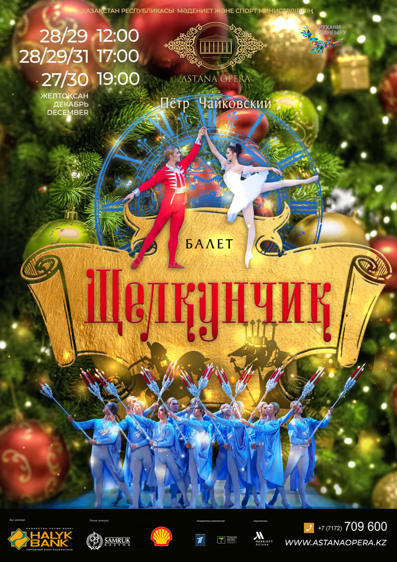 27, 28, 29, 30, 31 декабря 2019 года в ГТОБ «Астана Опера» будет представлен балет «Щелкунчик» великого русского композитора П. Чайковского в постановке выдающегося хореографа современности – Народного артиста СССР, лауреата Государственных премий Юрия Григоровича. Сценография – Народного художника СССР, лауреата Государственных премий Симона Вирсаладзе.