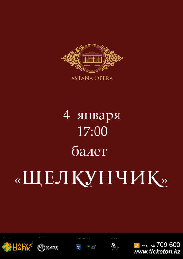 4 января 2020 года в 12:00/17:00 в ГТОБ «Астана Опера» будет представлен балет «Щелкунчик» великого русского композитора П. Чайковского в постановке выдающегося хореографа современности – Народного артиста СССР, лауреата Государственных премий Юрия Григоровича. Сценография народного художника СССР, лауреата Государственных премий Симона Вирсаладзе. Дирижер – Арман Уразгалиев.