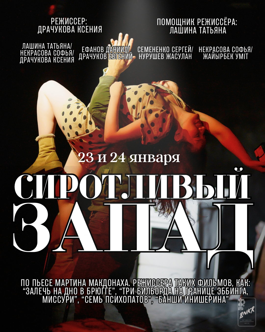 Драматургической основой спектакля стала одноимённая пьеса ирландского драматурга Мартина Макдонаха «Сиротливый запад».